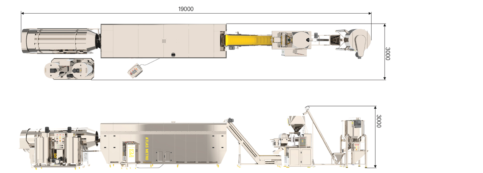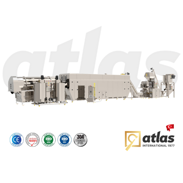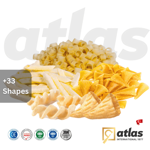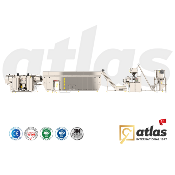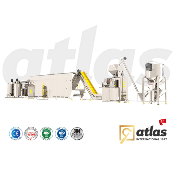 The Atlas Corn Chips Line is a compact, high-efficiency solution for manufacturing a wide variety of corn-based snacks. Designed for growing food processing operations, this fully automatic line delivers a production capacity of 150–200 kg/hour, powered by 68 kW, and fits within a 70 m² footprint. Built with durable 304 stainless steel, the line ensures long-term hygiene and performance.