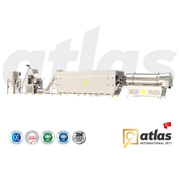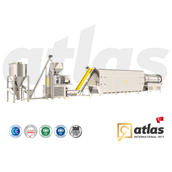 The system includes a corn blender for hydration, spiral conveyor, and the advanced ATLAS EXTRUSION 2020 extruder capable of producing 40+ chip shapes depending on raw material type, flavoring, and grain thickness. Post-extrusion, corn chips are transferred via conveyor or air blower to a customizable drying oven (diesel or gas by Riello Italy) for moisture removal. The final stage features a flavoring drum, double oil & flavor blender (400L capacity), and oil pump, ensuring uniform flavor coating and premium product quality.