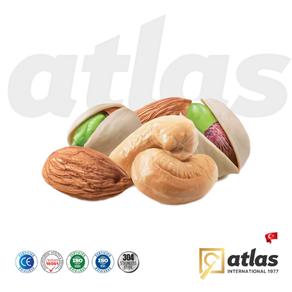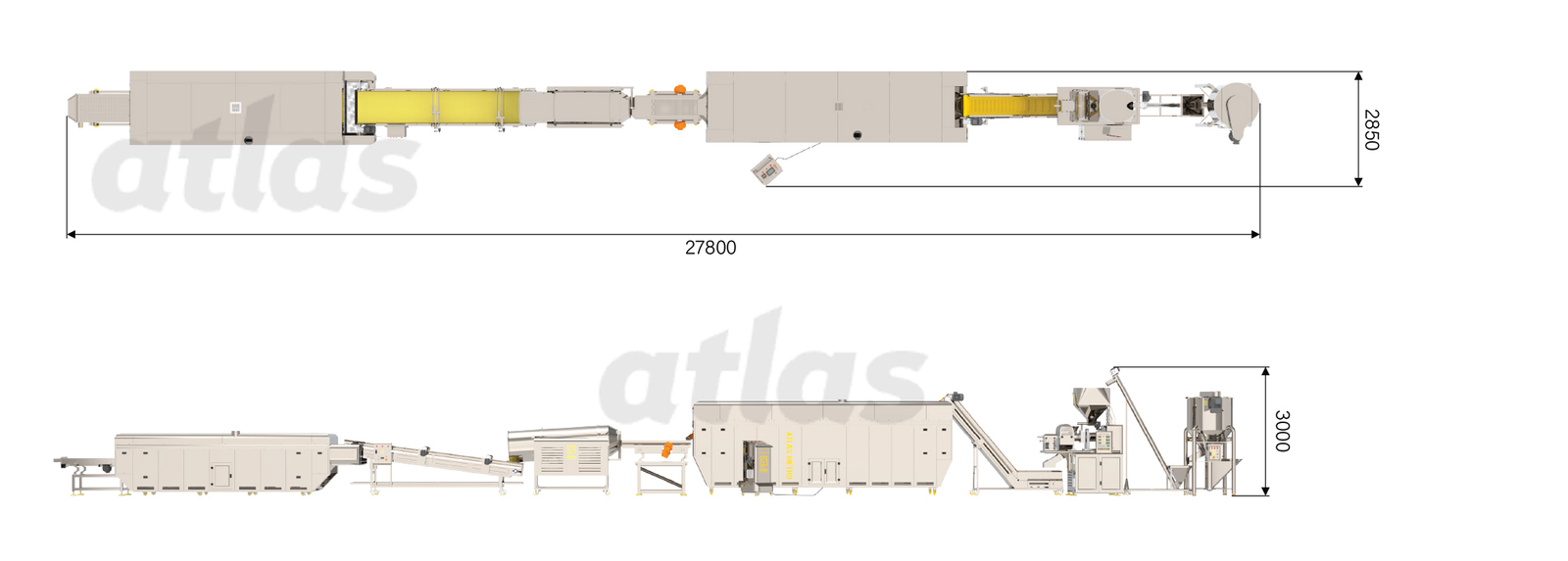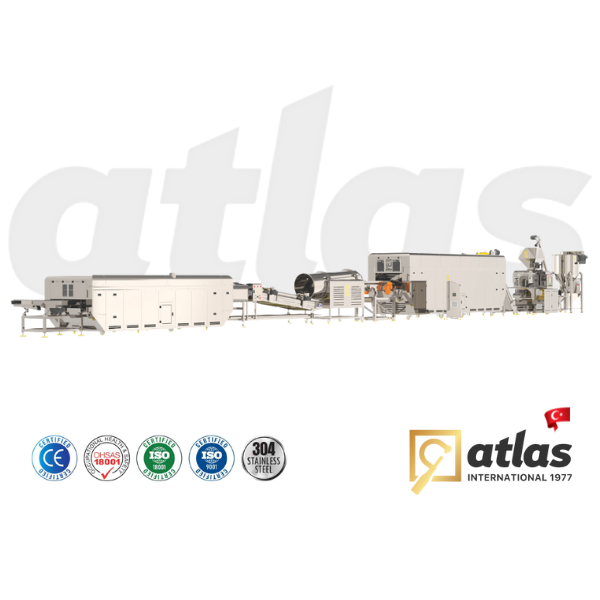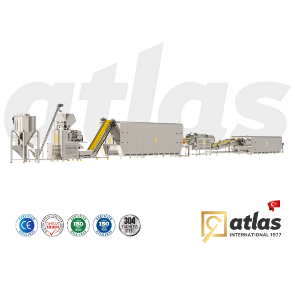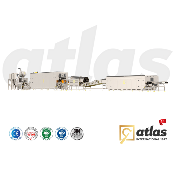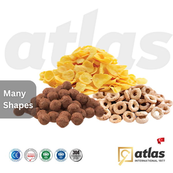 The line includes a corn blender, spiral conveyor, and ATLAS EXTRUSION 2024, capable of forming multiple flake shapes based on grain thickness and ingredients. After extrusion, flakes move through a customized drying oven (diesel, gas, or electric system from Riello Italy), followed by vibrator conveyors and a flavor drum for applying chocolate or flavor using a 400-liter oil & flavor blender. A second oven ensures coating adhesion, while a final cooling conveyor prepares the cereal for packaging—making CFL200 ideal for commercial corn flakes production.