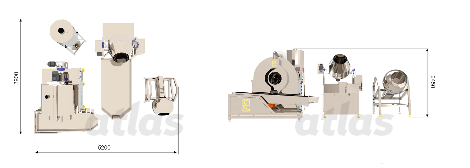 The system features a customized roasting unit (gas or diesel-powered) equipped with a vibration filter to separate excess salt during roasting. It includes both a fixed and a movable salting unit, with the latter offering a 180° rotating discharge angle for seamless transition to the cooling unit, which is equipped with dual suction turbines for fast, even product cooling. The NRS75 is ideal for nut processing plants looking for an energy-efficient, compact, and hygienic solution.